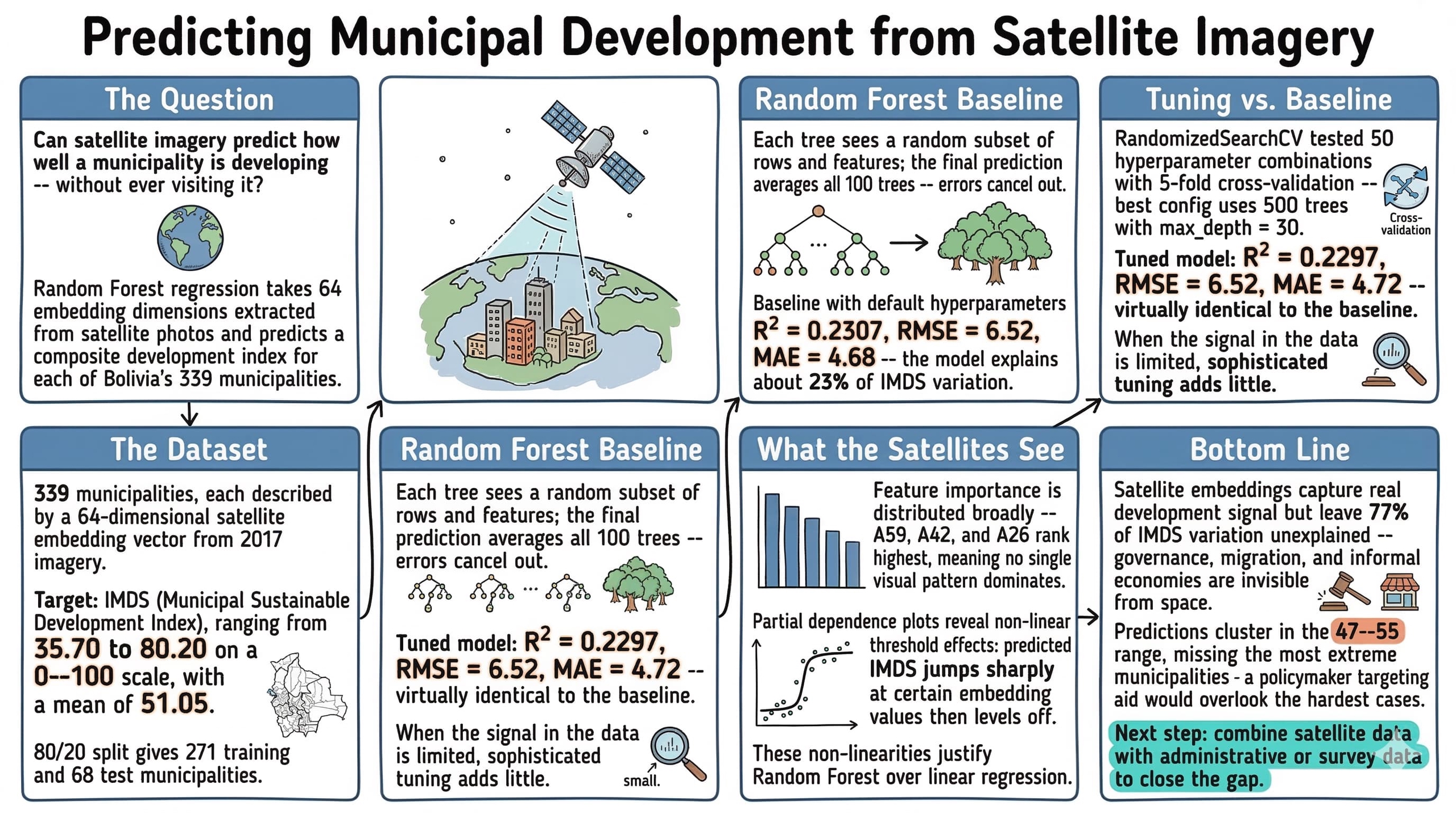 The tuned model achieves R² = 0.2297, RMSE = 6.52, and MAE = 4.72 on the test set — essentially identical to the baseline (R² = 0.2307, RMSE = 6.52, MAE = 4.68). This is a common finding with small datasets: the tuning improved CV performance slightly but the gains didn’t transfer to the specific test set. The model explains about 23% of IMDS variation, meaning satellite embeddings capture real but limited predictive signal for municipal development.