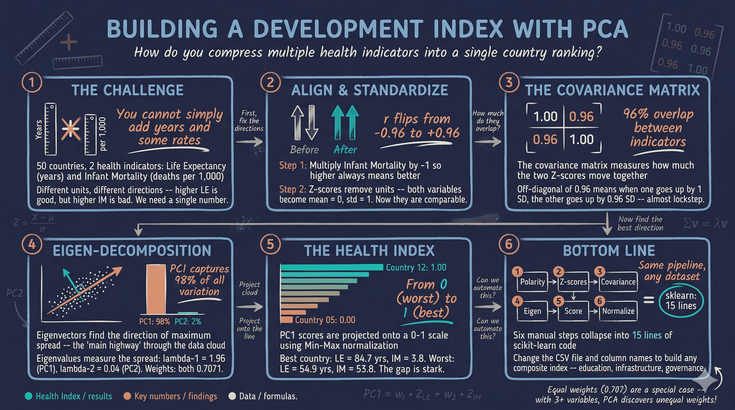 The answer to our opening question is clear: yes, PCA successfully reduces two correlated health indicators into a single Health Index. With a correlation of 0.96 between life expectancy and adjusted infant mortality, PC1 captures 97.97% of all variation — meaning our single-number index retains virtually all the information from both original variables.
