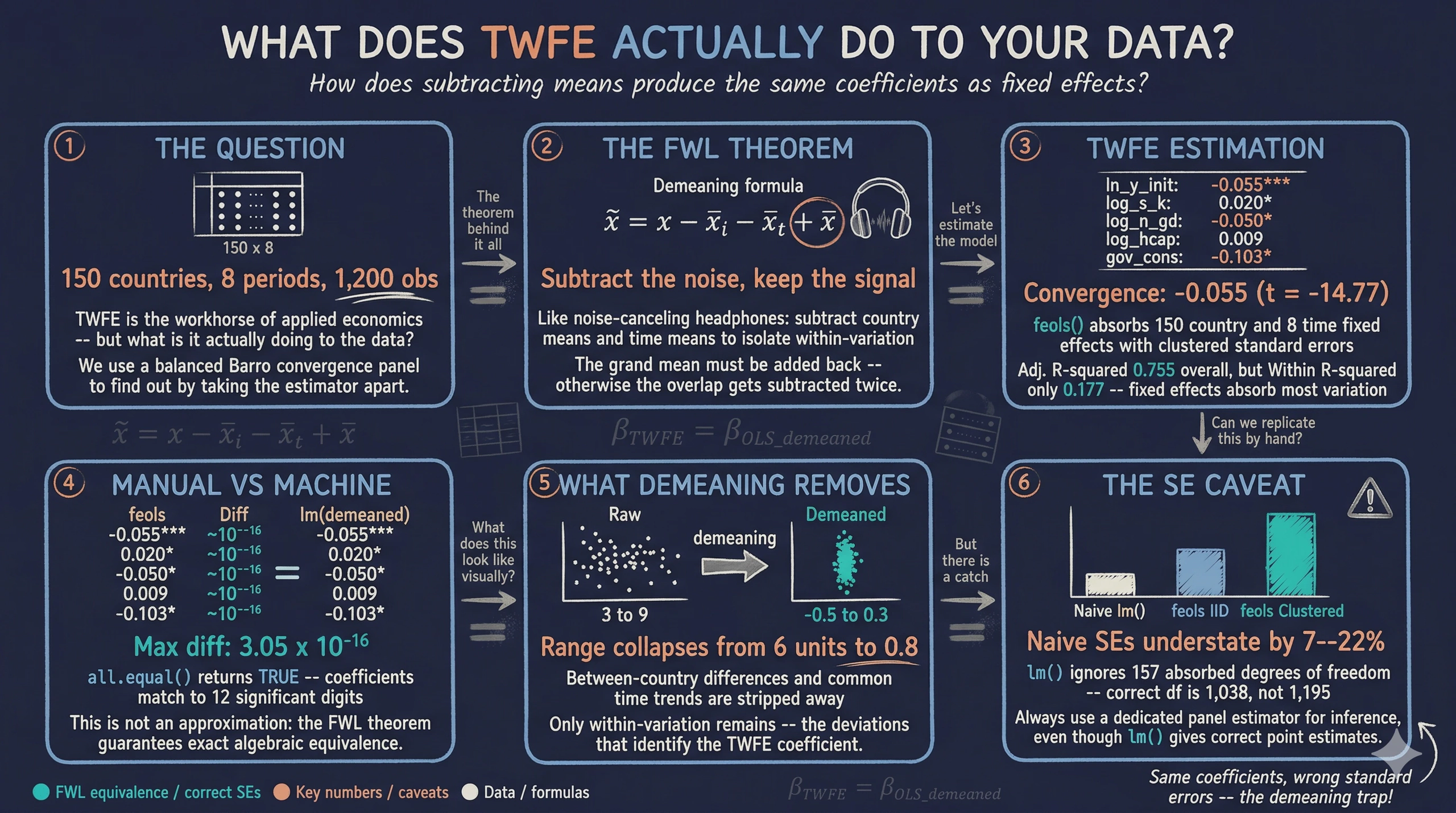 This tutorial answers these questions by taking TWFE apart. We estimate a standard growth regression with country and time fixed effects, then replicate the exact same coefficients by hand — subtracting country means, time means, and adding back the grand mean before running ordinary least squares. The result is not an approximation: the coefficients match to 12 significant digits. The theoretical foundation for this equivalence is the Frisch-Waugh-Lovell (FWL) theorem, a fundamental result in econometrics that connects controlling for variables in a regression to projecting them out by residualization.