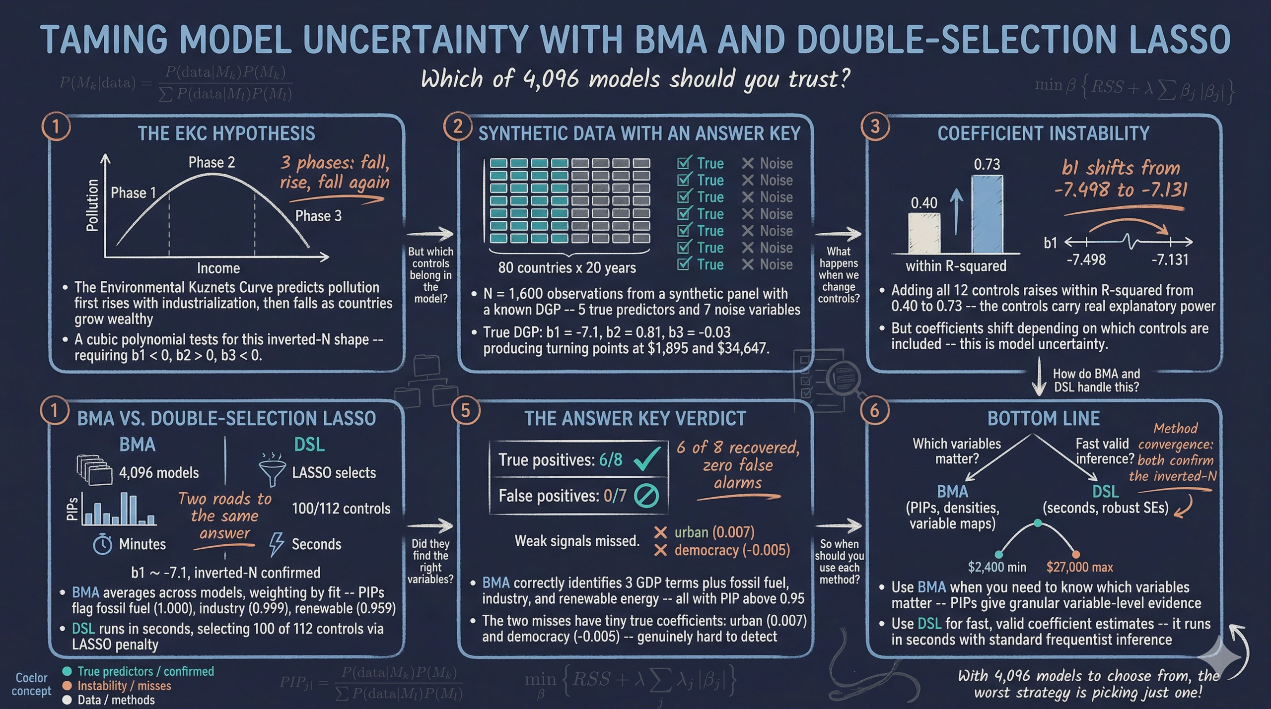 Testing for this shape requires a cubic polynomial in GDP per capita — and beyond GDP, many other factors might affect CO2 emissions. With 12 candidate control variables, there are $2^{12} = 4{,}096$ possible regression models. Which model should we estimate? This is the model uncertainty problem.