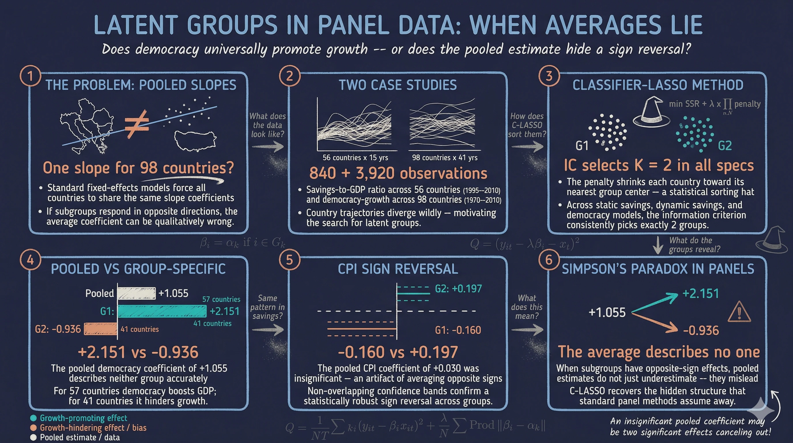 Pooled estimates can be misleading. The insignificant pooled CPI coefficient ($+0.030$) in the savings model masked opposing effects of $-0.160$ and $+0.197$ in two latent groups. The pooled democracy coefficient ($+1.055$) masked a split of $+2.151$ versus $-0.936$.