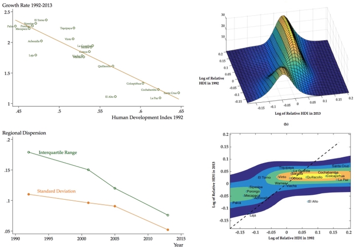 Almost half of the population of Bolivia currently lives in the metropolitan regions of La Paz, Santa Cruz, and Cochabamba. Motivated by the potential for growth and development of these regions, this article documents the evolution of their human development differences over the 1992-2013 period. In particular, using the United Nations' human development index at the municipal level, this paper evaluates the process of regional convergence through the lens of three frameworks: beta, sigma, and distributional convergence. The overall result is an increasing tendency toward convergence that is driven by both slower forward mobility of the less developed regions and faster backward mobility of the more developed regions. The distributional convergence framework provides further insights and suggests that the formation and merging of multiple convergence clusters is a salient feature of inequality reduction. Furthermore, in the long-run, convergence appears to be characterized by the transformation of a trimodal distribution into a left–skewed unimodal distribution. The article concludes emphasizing that the cross-regional distribution of human development in Bolivia is quite sticky at its left tail and, as a result, the least developed regions are still relatively far from achieving complete convergence in the long run.