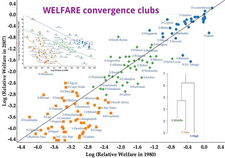 The cross-country convergence hypothesis is one of the central topics of long-run macroeconomics. This paper revisits this hypothesis in a context beyond GDP. It uses a novel welfare index that incorporates measures of consumption, leisure, life expectancy, and inequality. Based on a sample of 128 countries over the 1980–2007 period, the lack of global sigma and beta convergence is first documented. Next, the paper incorporates some recent developments from the unsupervised machine learning literature to evaluate the existence of local convergence. In particular, the application of a distribution-based clustering algorithm suggests the formation of three local convergence clubs. Under this classification, beta convergence is recovered for each club. However, only the core members of the richest club appear to be reducing their welfare differences in a way that is consistent with the strong notion of sigma convergence. Overall, these results re-emphasize the finding that beta convergence is necessary, but not sufficient for sigma convergence, even within convergence clubs and in a context beyond GDP.