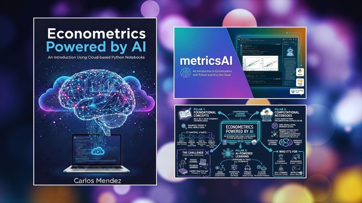 This book and its related website introduce a modern approach to econometrics education that integrates theoretical foundations with cloud-based computation and AI-enhanced learning tools. Designed as a computational companion to A. Colin Cameronโs ‘Analysis of Economics Data: An Introduction to Econometrics’, it addresses persistent challenges in learning econometricsโpassive textbook engagement, technical barriers, and the gap between theory and implementationโby combining three pillars: foundational econometric concepts, interactive Python notebooks accessible through a zero-installation cloud environment, and AI-powered learning resources. Across seventeen chapters spanning statistical foundations to advanced topics such as panel data and causal inference, learners work hands-on with real data using modern Python libraries while remaining grounded in established statistical and econometric theory. Visual summaries, slides, quizzes, podcasts, videos and AI tutors provide multimodal reinforcement and personalized feedback, supporting diverse learning styles. Together, these elements form a comprehensive learning ecosystem that reimagines how econometrics can be taught and learned in the era of cloud computing and artificial intelligence.